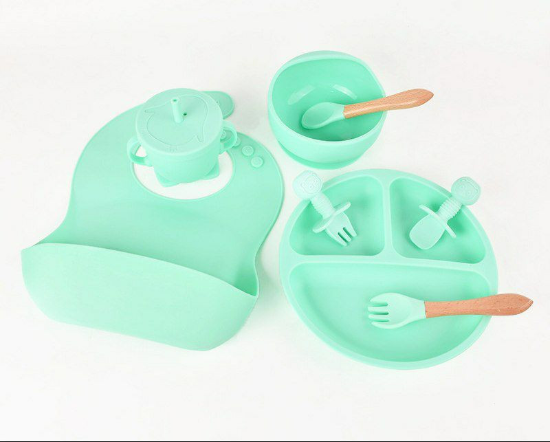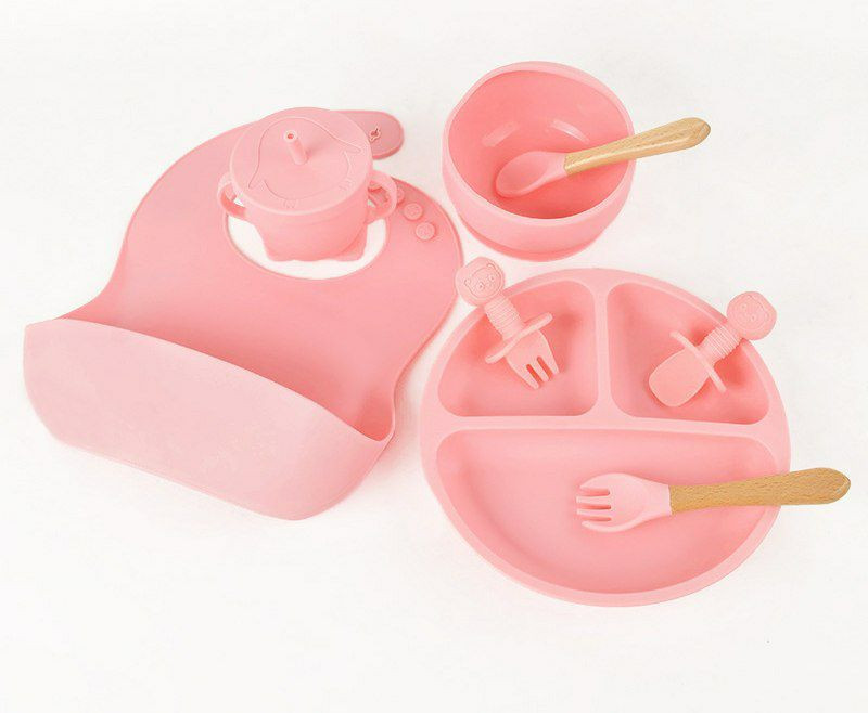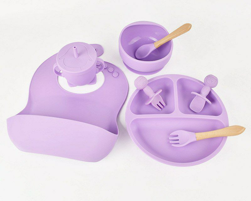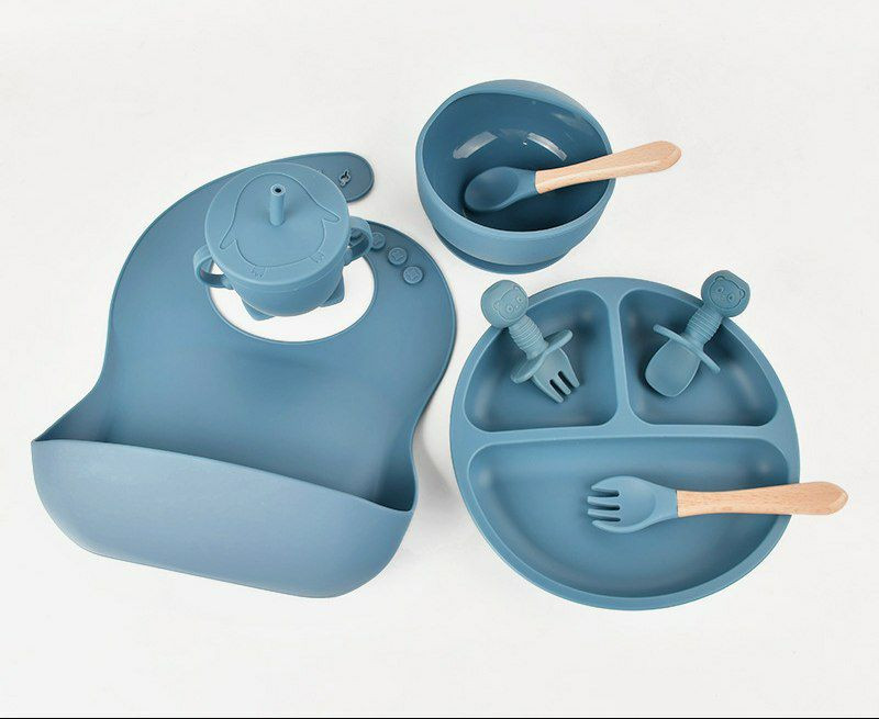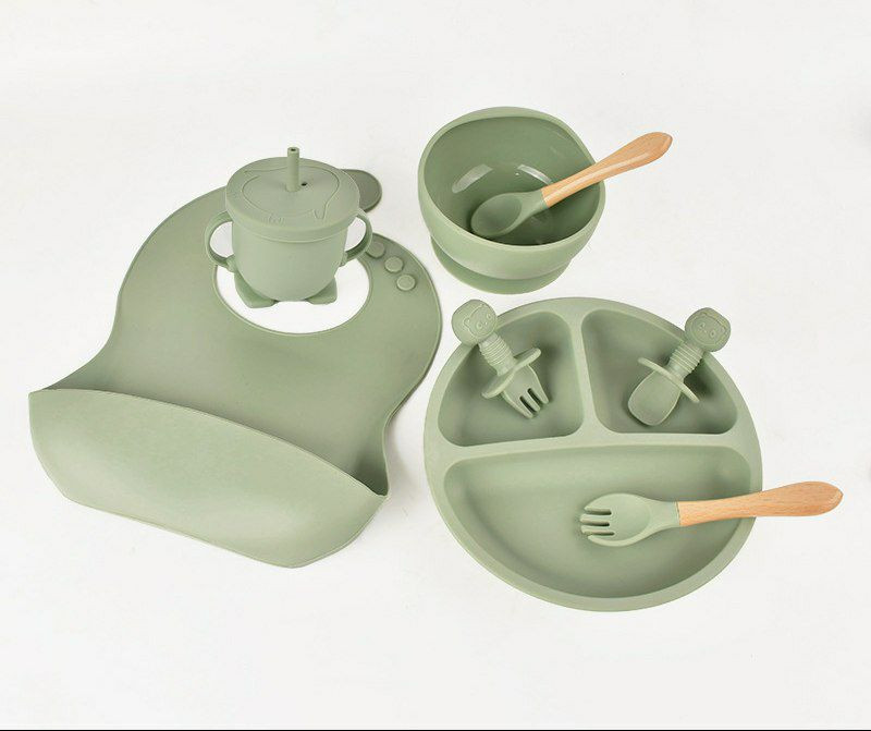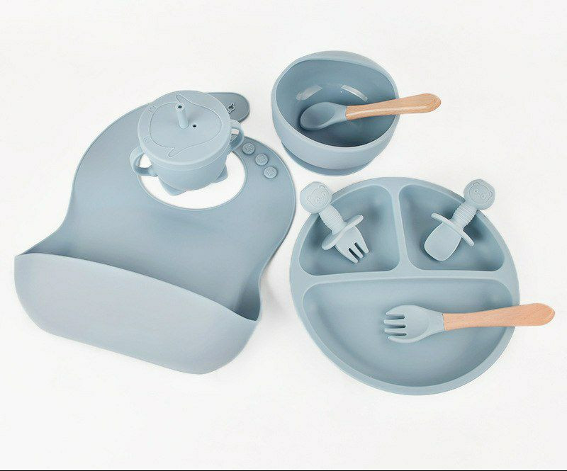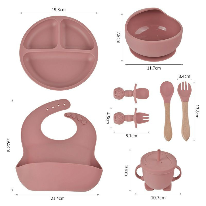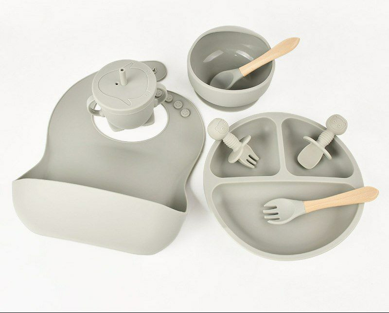 Assiette d'alimentation en silicone pour enfants, lot de 8pieces, pour bebe, bol, tasse, couvert vaisselle pour sevrage et apprentissage a manger