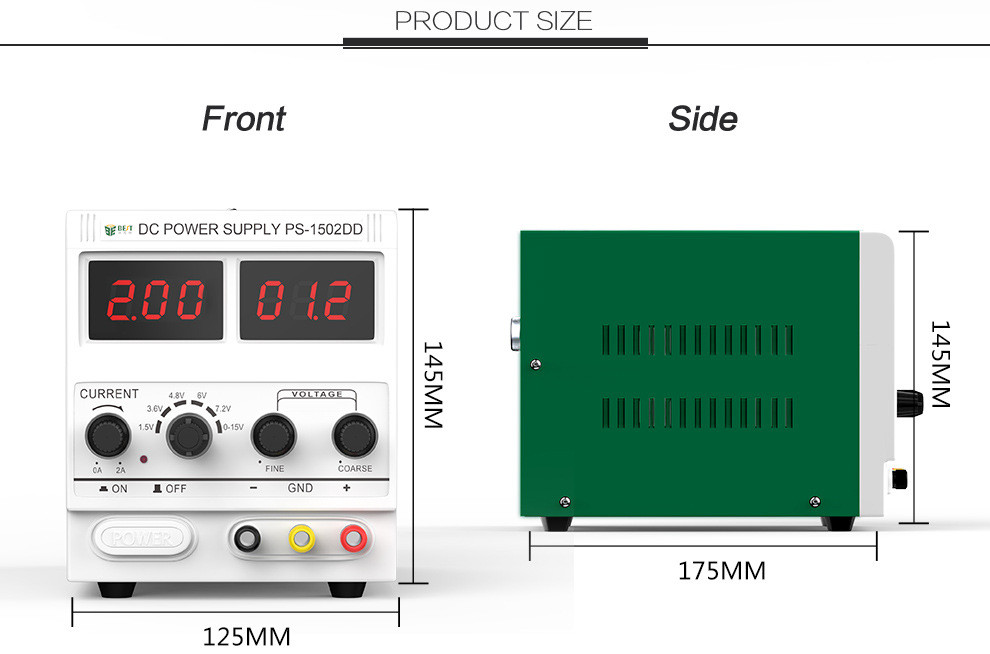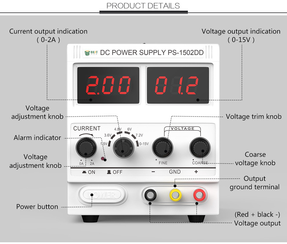 Alimentation électrique DC, modèle PS-1502DD, couramment utilisée pour la réparation d'appareils électroniques, notamment les téléphones portables et les ordinateurs portables.
