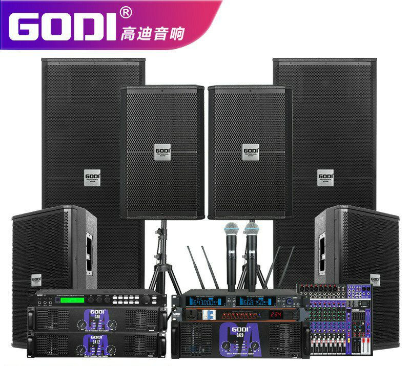 Ensemble complet d'équipements audio professionnels de la marque GODI, conçu pour des événements de grande envergure.