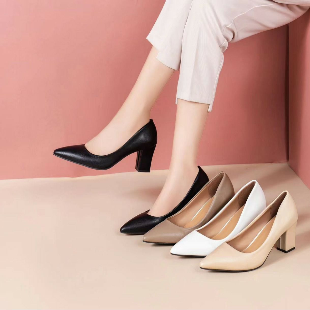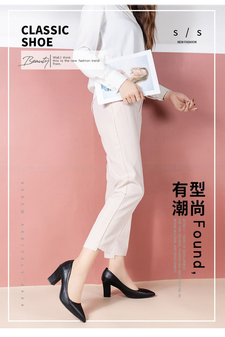 Chaussures simples élégantes classes et tendance pour femmes avec talons épais et tempérament. Nouvelles chaussures de travail d'automne à bout pointu avec bouche peu profonde et talons hauts individuels de style coréen.