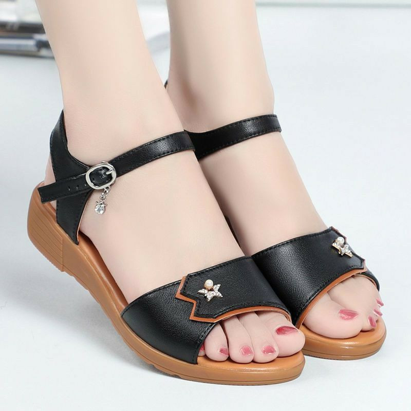 Nouvelles sandales polyvalentes à la mode pour mères d'âge moyen et âgées sandales antidérapantes à fond souple en cuir souple sandales compensées latérales souples pour femmes