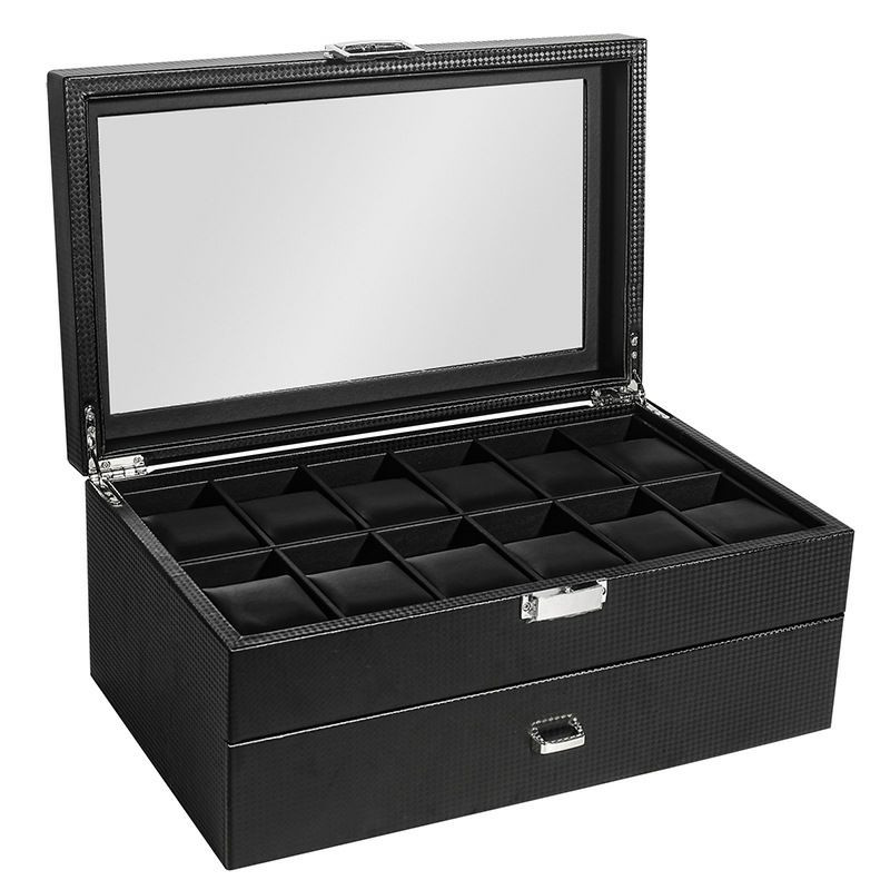 Double couche pu 24 bits boîte de rangement de montre boîte à bijoux en fibre de carbone boîte d'affichage de bracelet boîte-cadeau bracelet