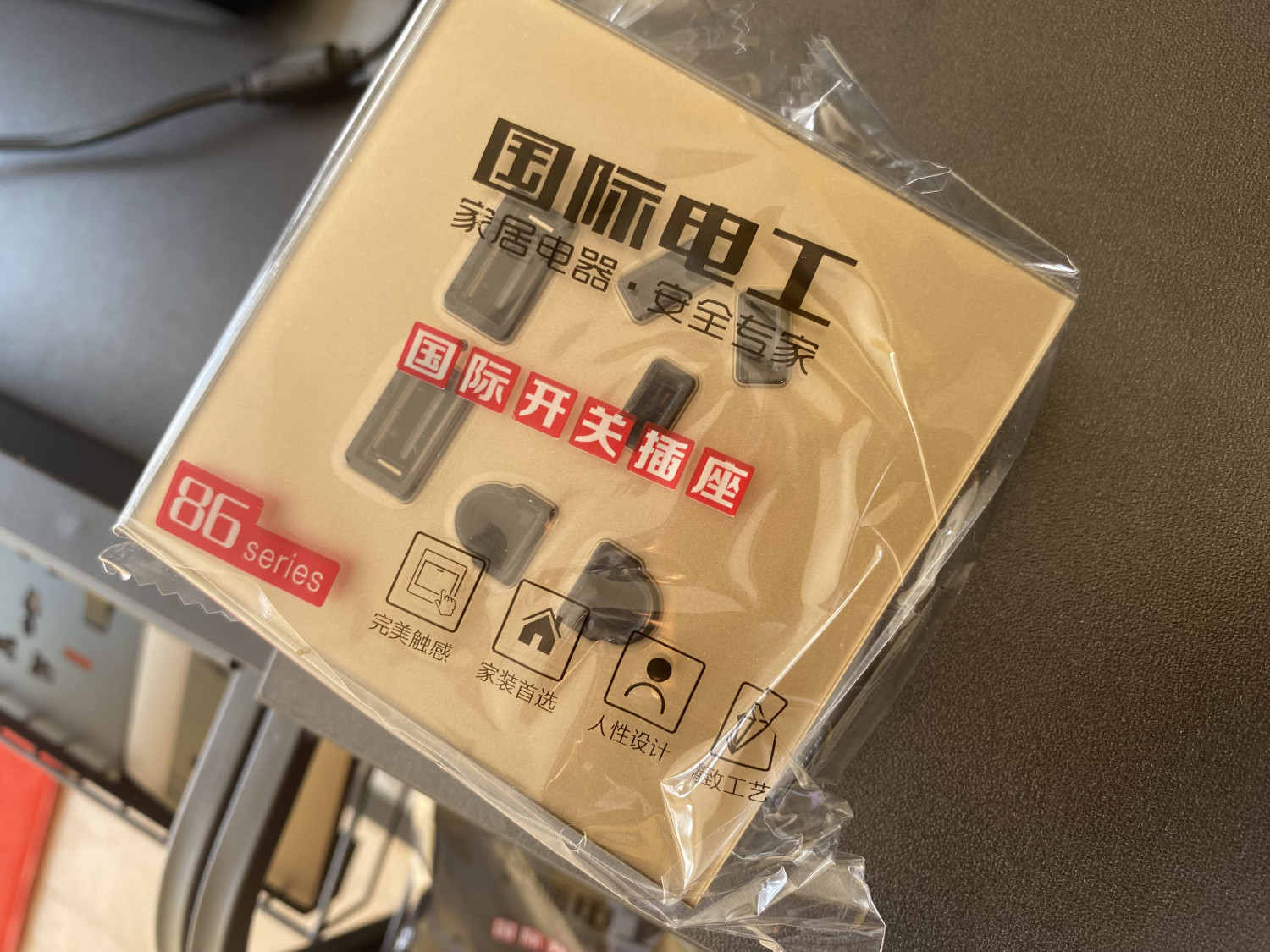 ComOne: Prise électrique doré et avec du verre trempé - Prise or de luxe - deux trous + 2 ports usb