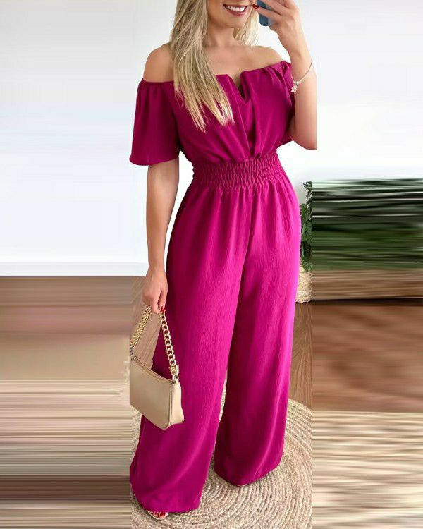 Combinaison longue pour femmes, mode épaules dénudées décontracté plaine manches courtes taille froncée quotidien longue jambe large combinaison 2025