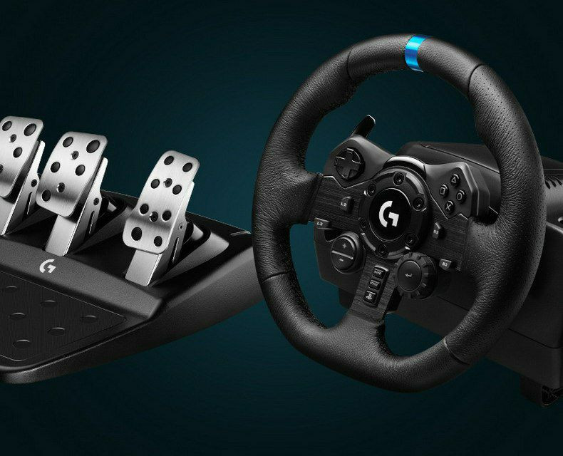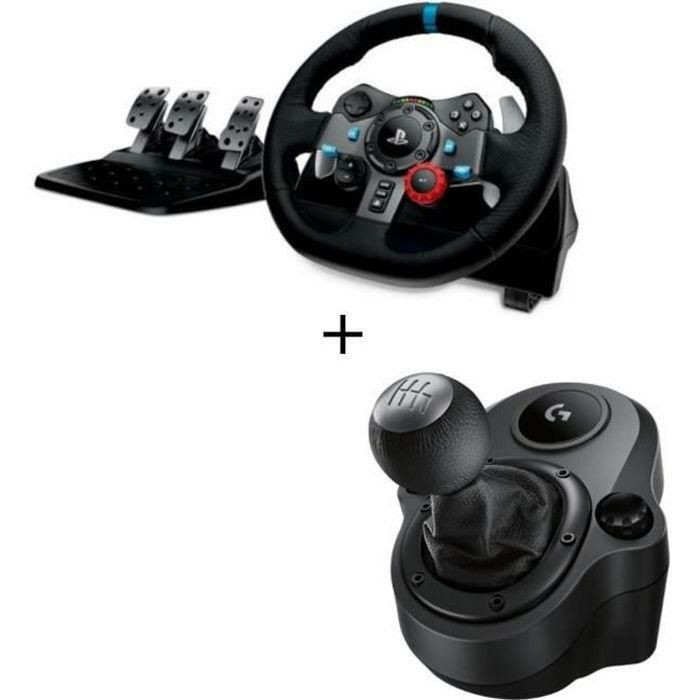 Volant de course et pédalier Logitech G923 Driving Force, accompagné du levier de vitesses Driving Force Shifter.
