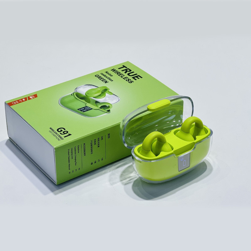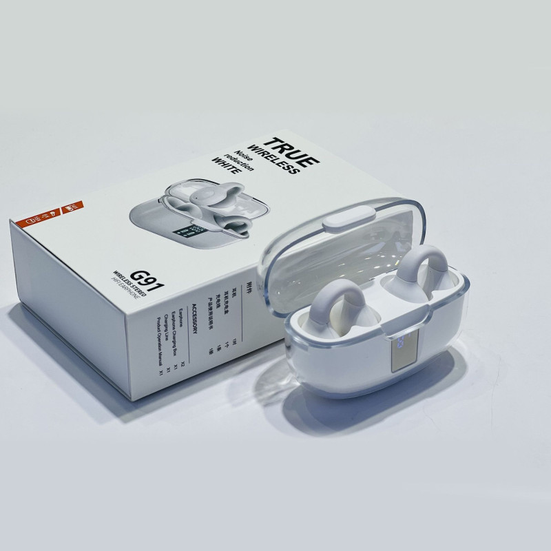 Ecouteurs Bluetooth G91 sans fil OWS avec boîtier transparent, fonction anti-bruit, affichage numérique, conçu pour le sport et la musique, idéal pour les environnements de sport et les appels téléphoniques.